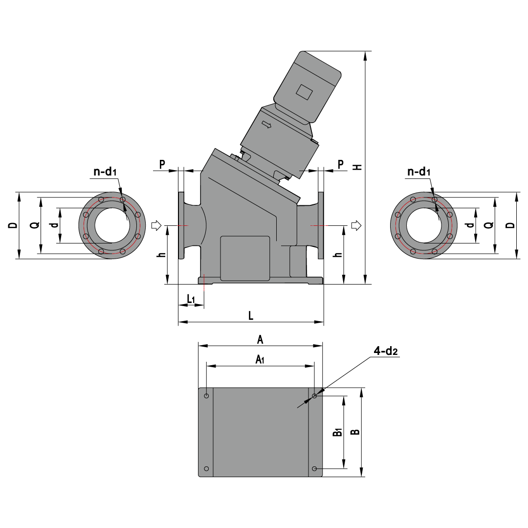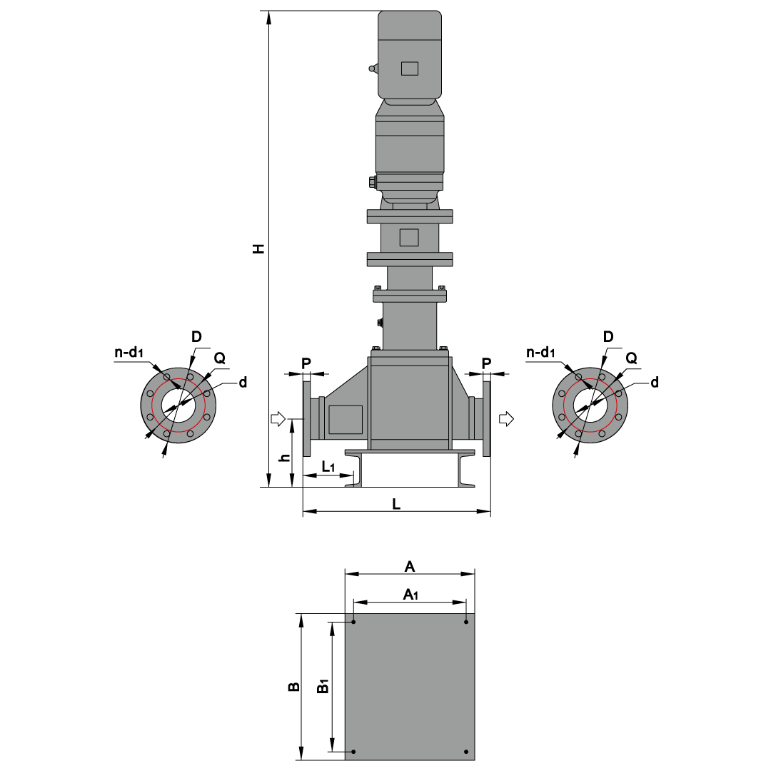 | SQ Series | L | H | h | A | A1 | B | B1 | d2 | L1 | Flange | d | D | Q | d1 | n | P | |